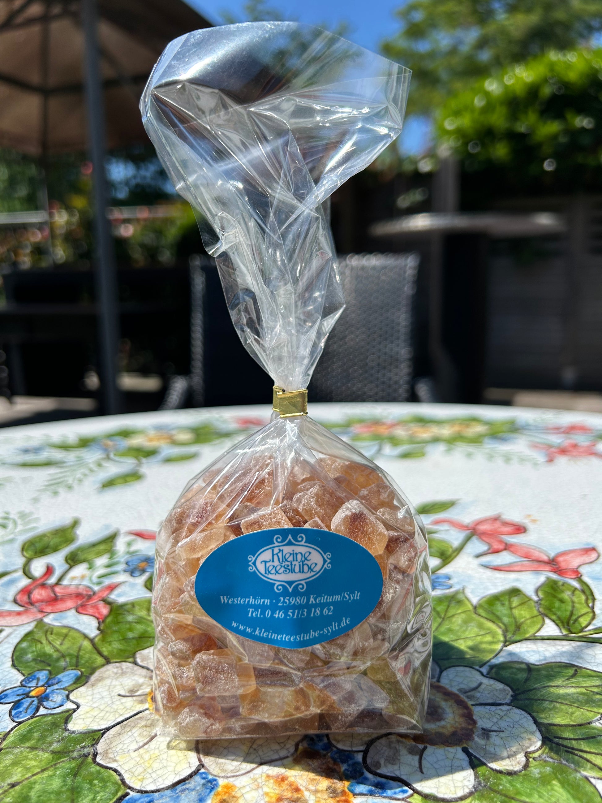 Brauner Kandis: Wird aus unraffiniertem Zucker hergestellt und hat eine goldene bis braune Farbe sowie einen leicht karamelligen Geschmack.