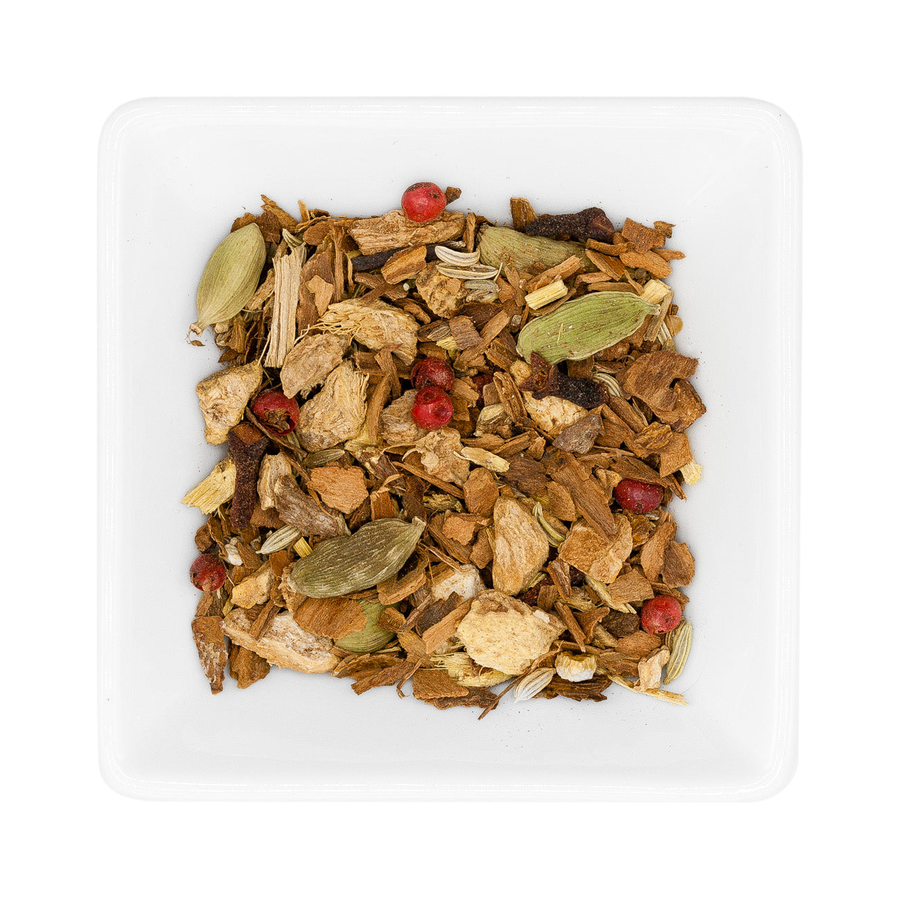 Grüner Gunpowder Tee, Zimtstücke, Ingwerstücke (Ingwer, Zucker), roter Pfeffer, Nelken, Fenchel, Kardamon